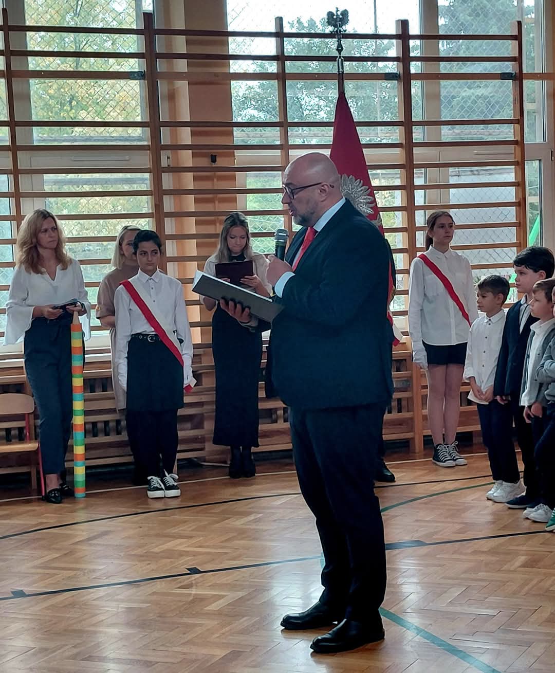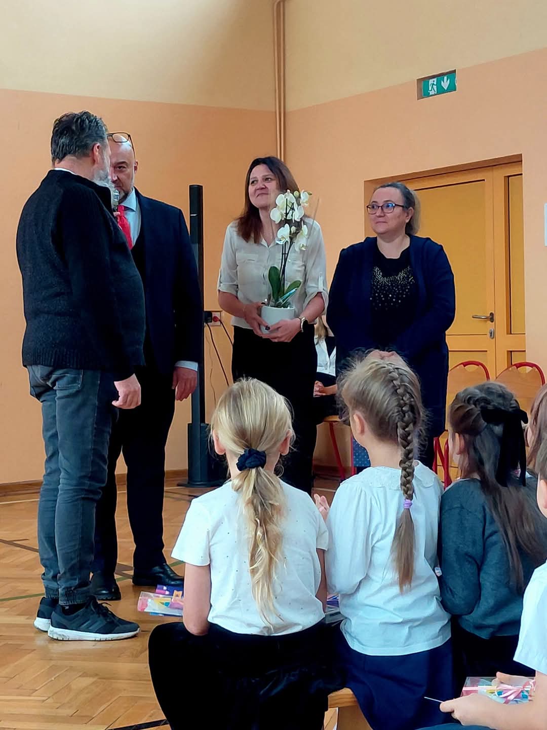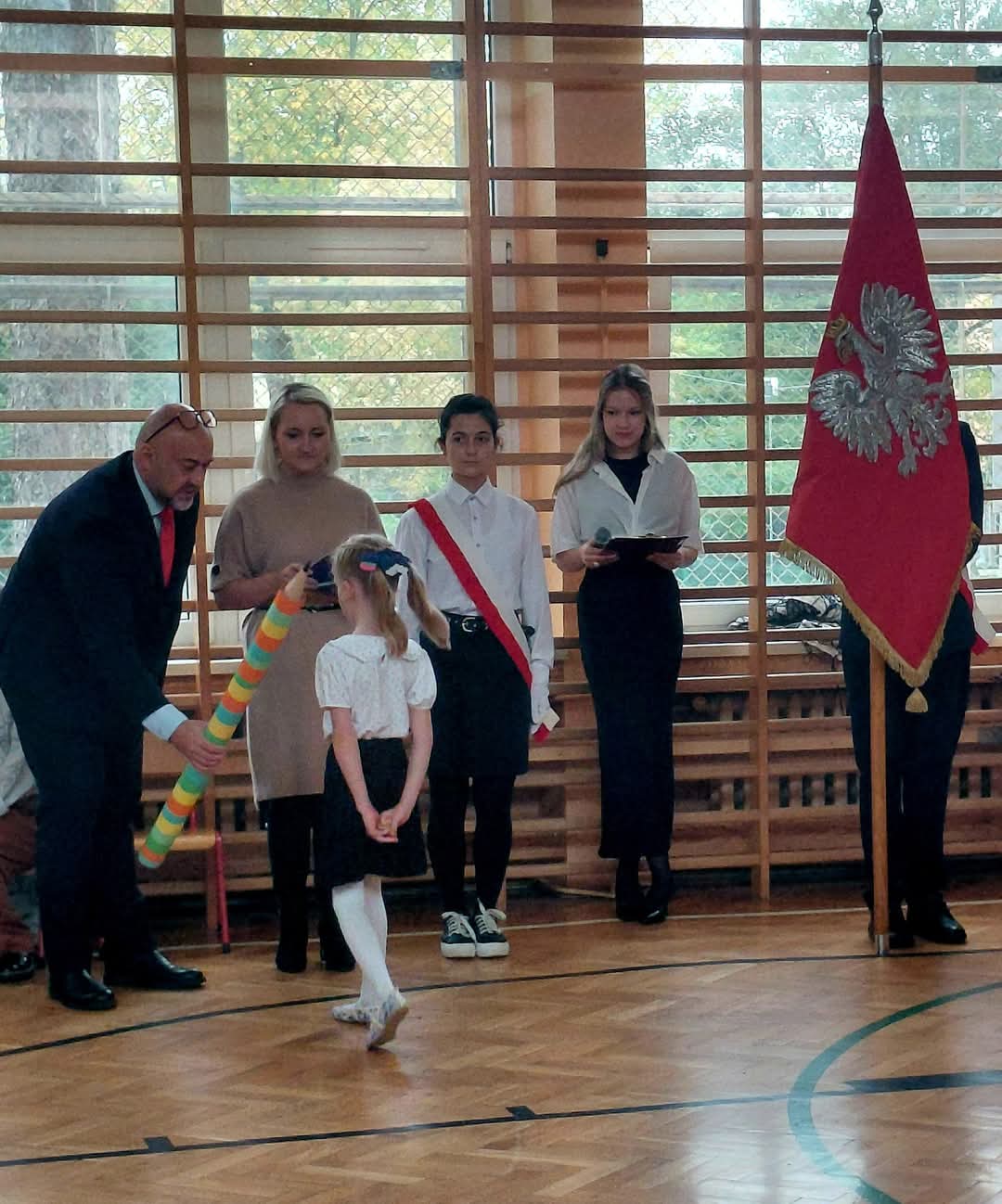 14 października - Dzień Edukacji Narodowej. Z tej okazji nasi pierwszoklasiści ślubowali, że będą: świetnymi uczniami, dumą swoich rodziców i nauczycieli oraz dobrymi kolegami. Pan dyrektor pasował wszystkich na uczniów pierwszej klasy. Uroczystość dla naszych pierwszaków przygotowały klasy drugie, a upominki - Rada Rodziców, której bardzo dziękujemy za pyszny - jak zwykle - tort. Wśród tych radosnych chwil, pojawił się moment smutny - nasz drogi, niezastąpiony Pan Irek, nasz święty Mikołaj opuszcza nas i odchodzi na emeryturę. Będziemy tęsknić.