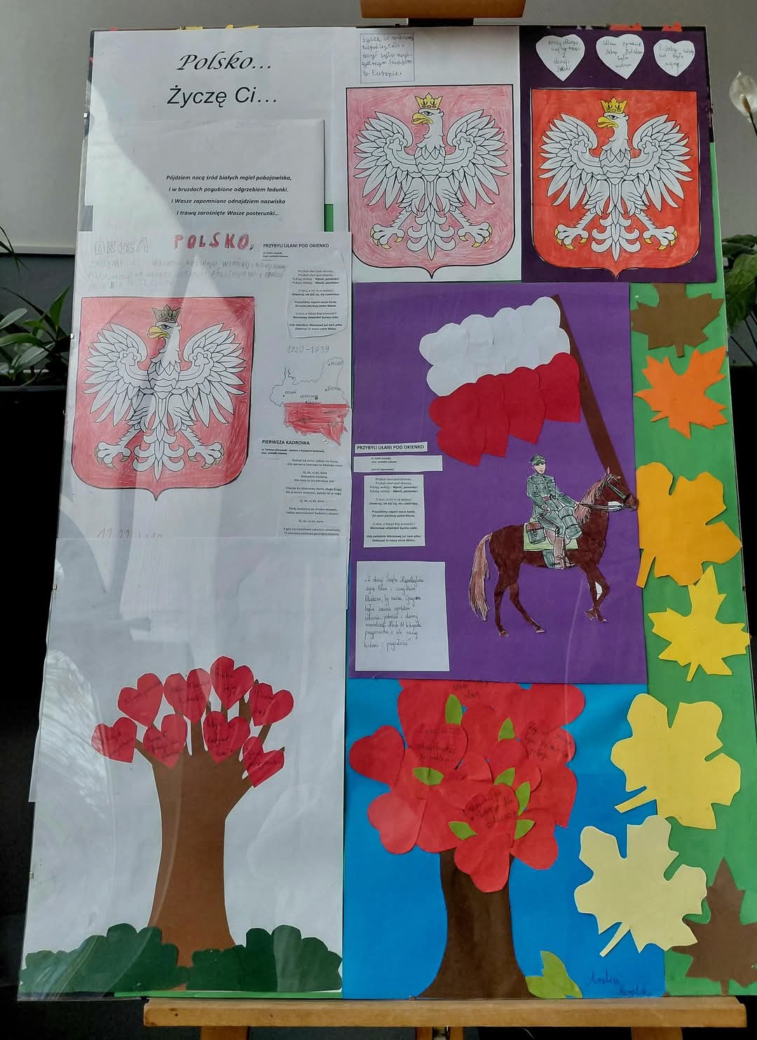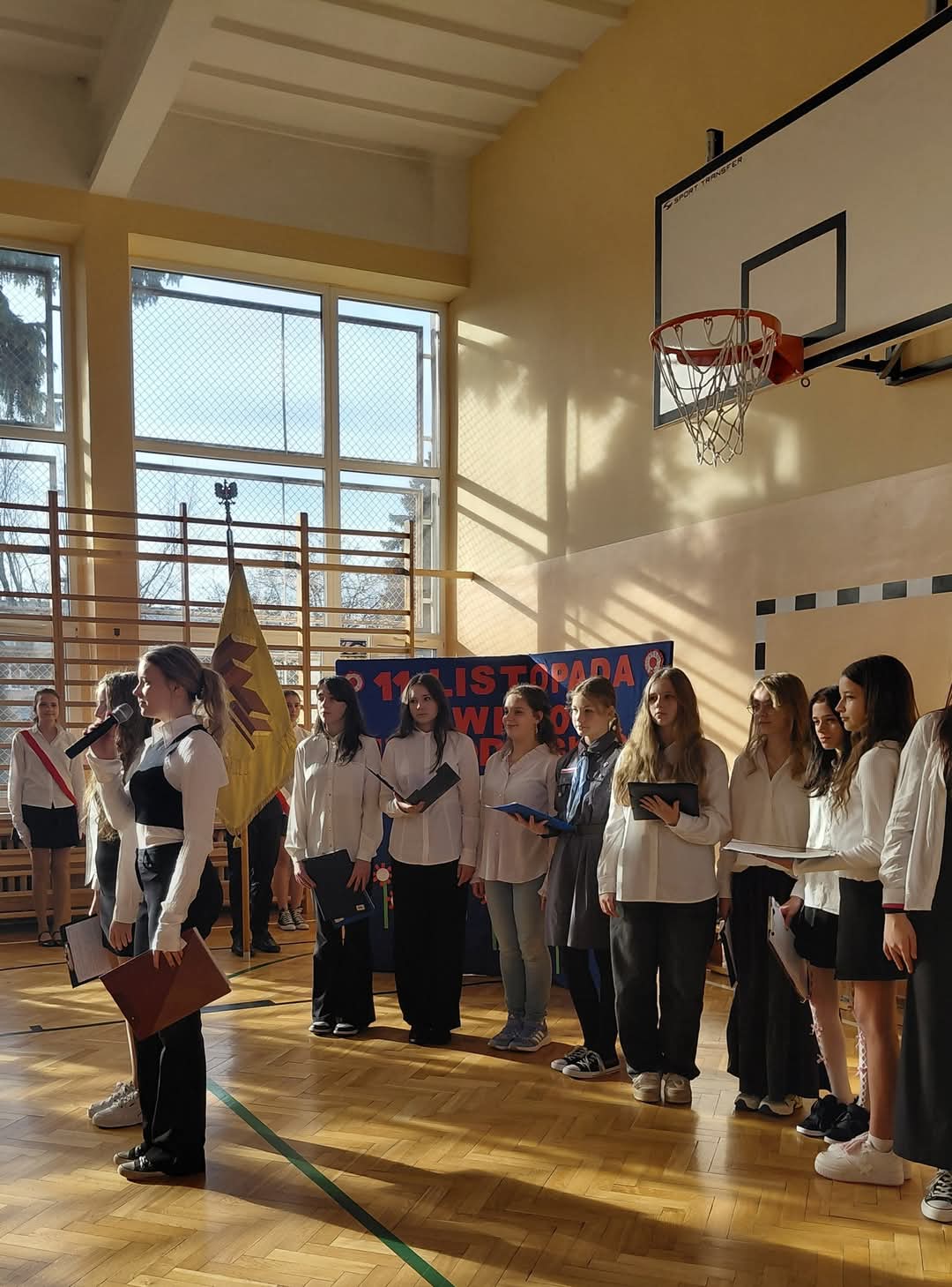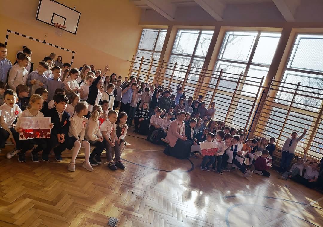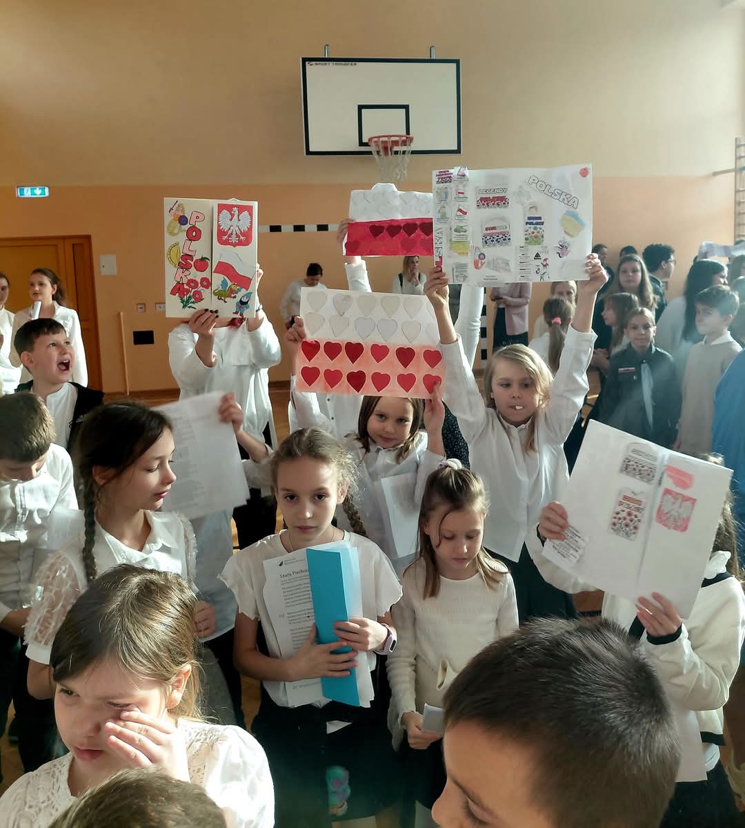 Nasza szkoła była dziś biało-czerwona. Z okazji niedawno obchodzonego Święta Niepodległości nasi uczniowie rozwiązywali patriotyczne zagadki, wzięli udział w niepodległościowej grze terenowej, wykonali piękne prace plastyczne przedstawiające polskie symbole narodowe i wzięli udział w uroczystym apelu, podczas którego swoje wokalne umiejętności zaprezentował świeżo utworzony szkolny chór. Bardzo dziękujemy naszemu chórowi i Samorządowi Uczniowskiemu za biało-czerwony, wzruszający dzień.