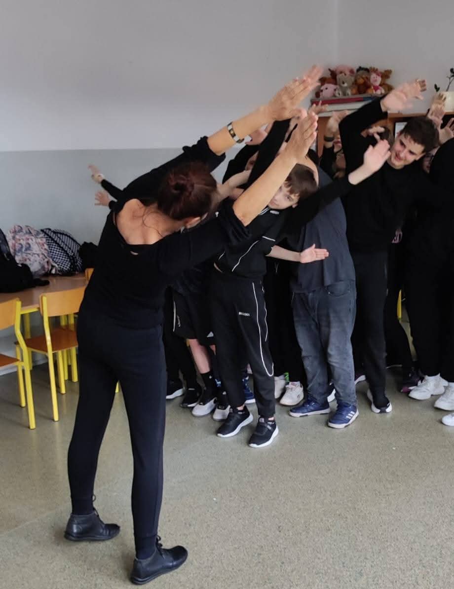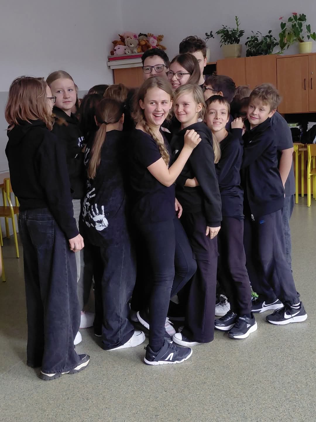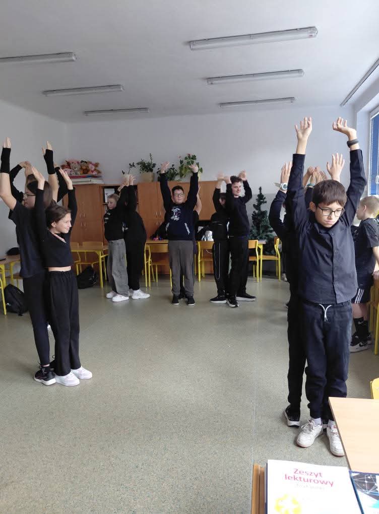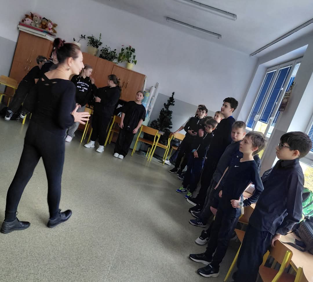 Podczas lekcji języka polskiego klasa 6b gościła wyjątkową osobę. Pani Ewa Cielesz - pisarka, pedagog, założycielka teatru dla dzieci - przyjechała specjalnie, aby przeprowadzić warsztaty teatralne właśnie z naszymi uczniami. Aby było profesjonalnie jak podczas prób w teatrze, wszyscy uczniowie ubrani byli w czarne stroje. W przeciwieństwie do koloru strojów humory dopisywały, dzieci świetnie się bawiły, a Pani Ewa była ich dużym urokiem. Po warsztatach przyszedł czas na słodki poczęstunek, który zawdzięczaliśmy Pani Marcie - mamie jednej z uczennic. Sernik i babeczki były pyszne. Bardzo serdecznie dziękujemy Pani Ewie Cielesz, która nie tylko pisze świetne książki, ale też w bardzo atrakcyjny sposób dzieli się wiedzą i umiejętnościami z dziećmi.